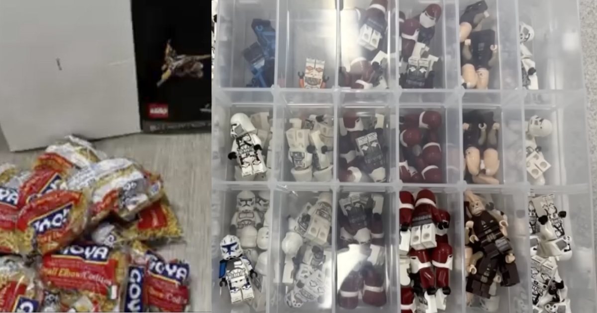 The idea was that the pasta would mimic the weight and that signature LEGO rattle, so the box still felt legit when returned for a refund. Which is either wildly clever… or something you come up with after staring into a pantry for too long.